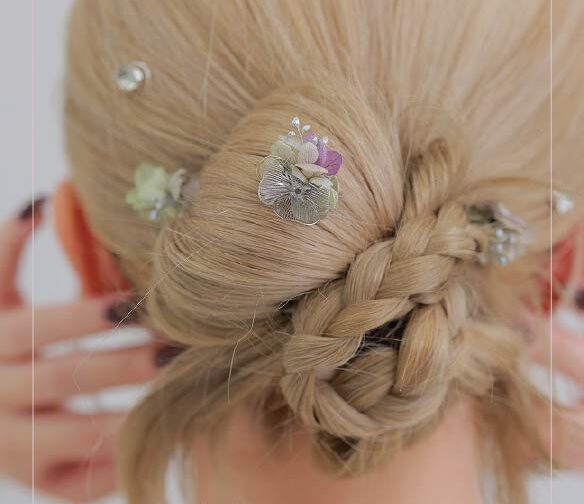 純白のアジサイが髪にやさしく彩りを添え、リボンやパールビーズとの組み合わせが上品な華やかさを演出します。